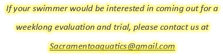 The Sacramento Aquatics Club aims to provide an opportunity for all swimmers to reach their greatest potential as both a person and an athlete while developing a life-long love of swimming. We believe that swimming should be a challenging, positive, and rewarding experience. Swimmers will not only learn swimming techniques and build endurance, but life lessons of perseverance, determination, personal responsibility, sportsmanship, confidence, respect for others, and the determination to push to new limits in a safe, monitored environment with properly trained staff. We believe that success is not determined just by winning a race but in the growth of a swimmer’s character, physical ability, and skill.